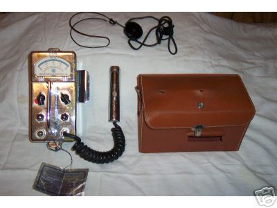 Old Radiation measuring instrument. Reading on instrument is, model 107C Professional Geiger Counter A.E.C.# SGM-49C. Precision Radiation Instruments, INC. Los Angeles 16, CALIF. Worlds Largest manufacturer of Radiation Instruments. Also has a tag on it, Reading, Precision Standard of Quality. The tag describes the quality of the product and a pledge of Quality to the public and also a Garantee on back. Tag is very readable but, bent and warn a bit. Instrument in fair condition. Has some pitting on it but, still looks unique. Comes with some sort of headphones and a leather case. On bottom of case it reads genuine leather. (Stamped into Leather). Does not have battery. We don't know too much about this item. Was found in basement that was cleaned out. We have no idea if or how this item works. But is sure one unique item. Great for electronics shop or collector. Instrument is chrome plated and salvagable. Needs some TLC. Specifications (107B) Detector: GM tube (30 mg/cm2), connected to the meter with a